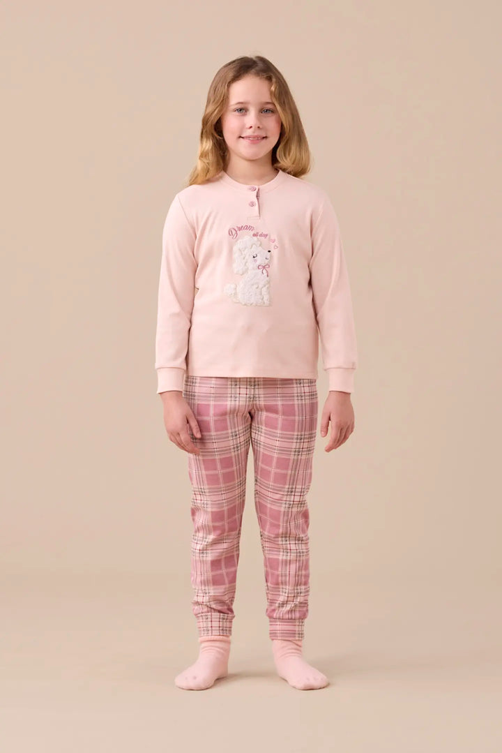 Pigiama bambina in caldo cotone con top unito con due bottoni e barboncino applicato. Pantaloni con stampa scozzese e polsini.