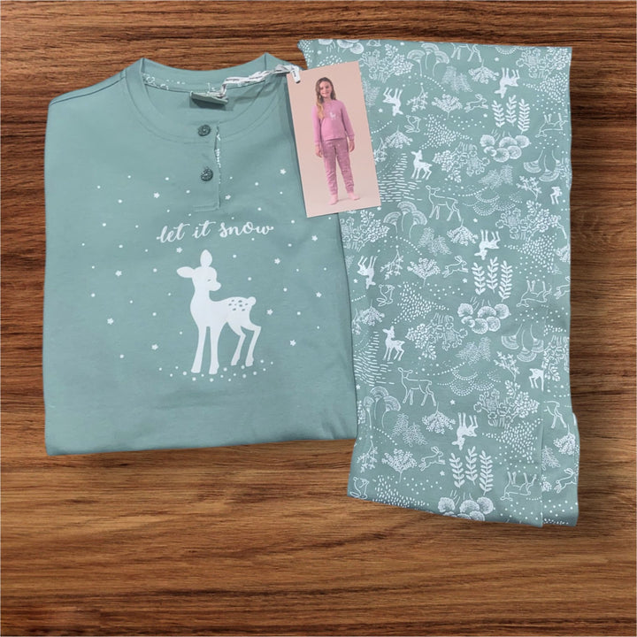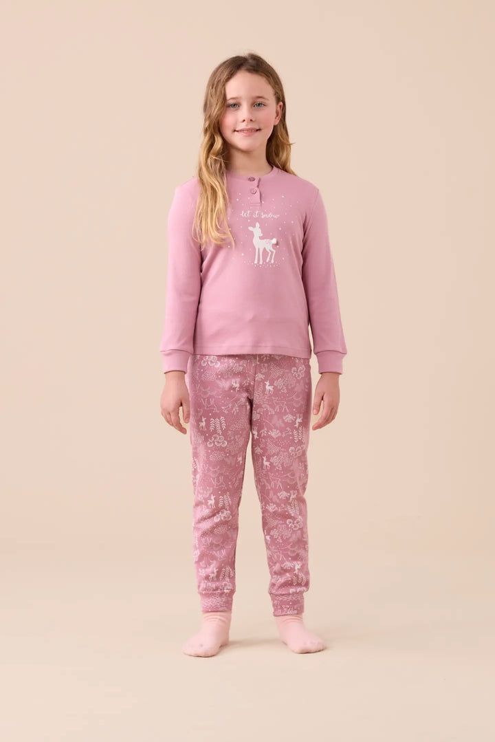Pigiama bambina in caldo cotone collo due bottoni e cerbiatto stampato sul davanti . Pantaloni con stampa fiabesca e polsini.