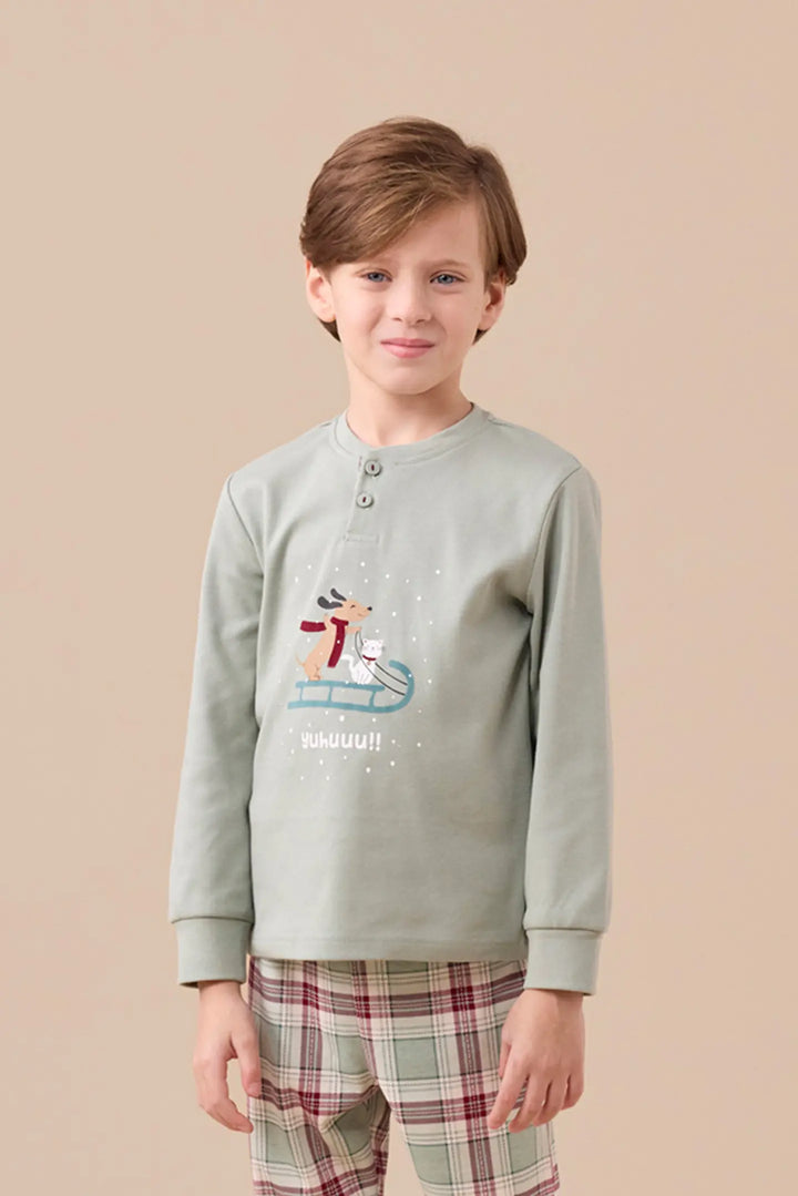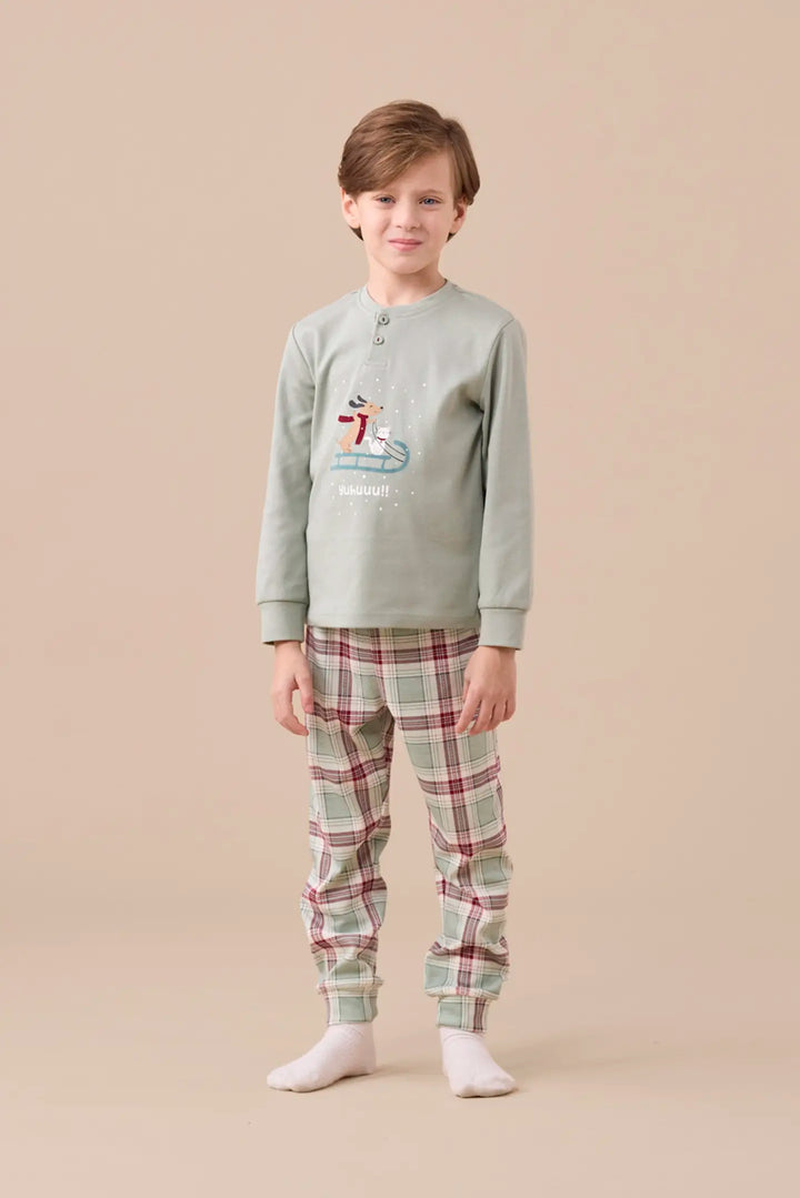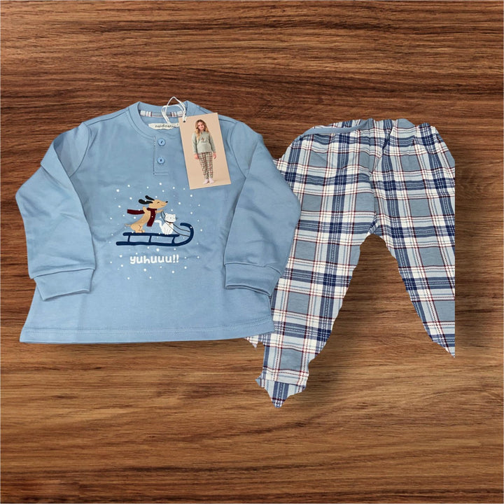 Pigiama bambina in caldo cotone con top unito con due bottoni e cagnolino con slitta stampato. Pantaloni con stampa scozzese e polsini.