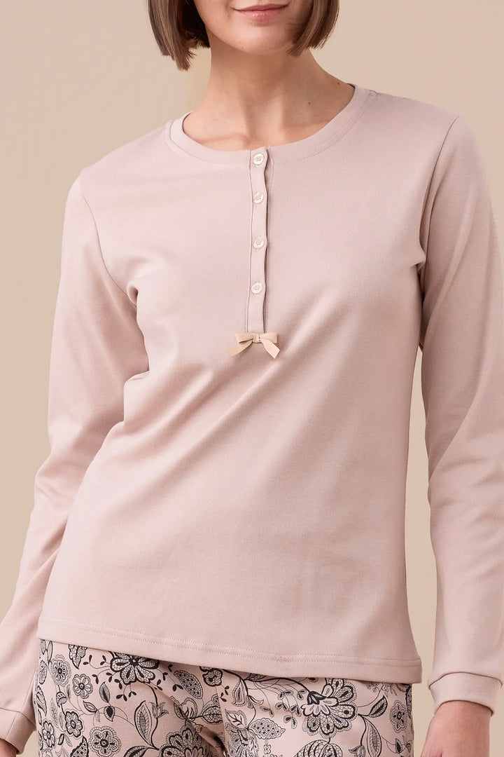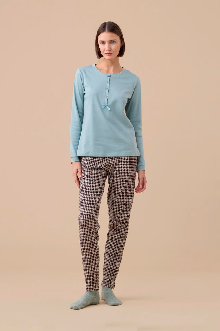 Pigiama donna invernale in caldo cotone. Top unito con collo quattro bottoni e pantaloni stampati con polsini.