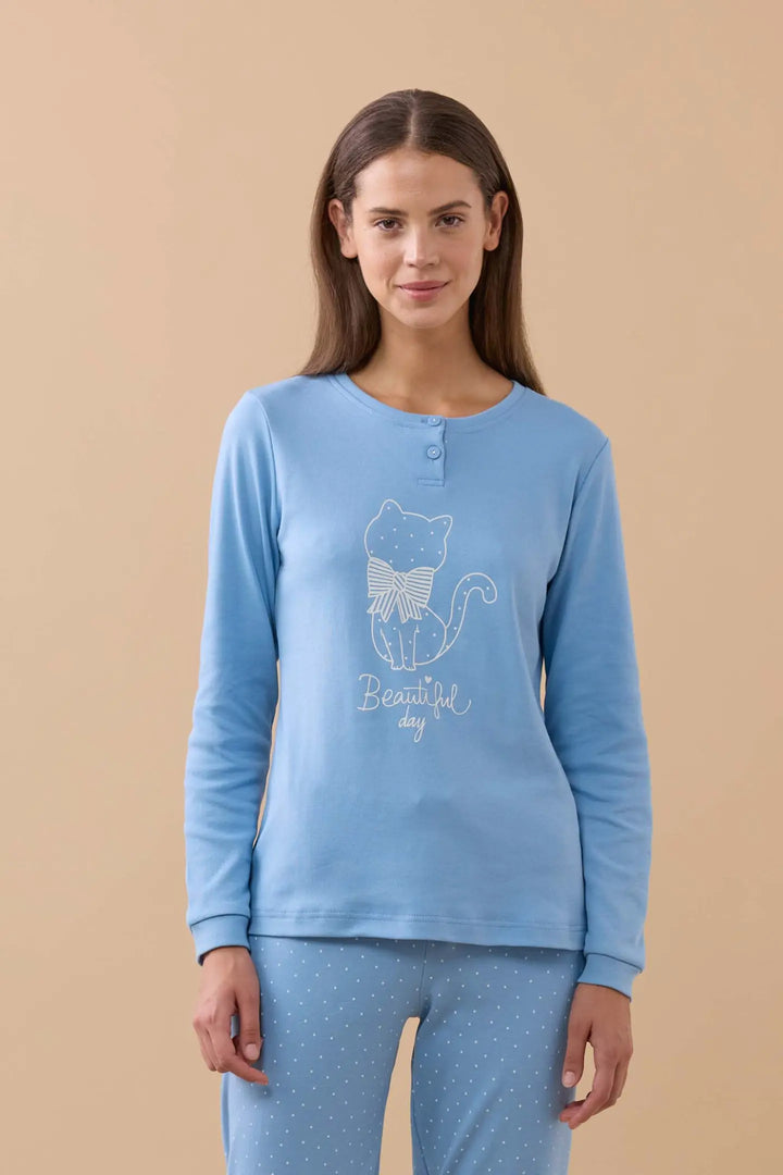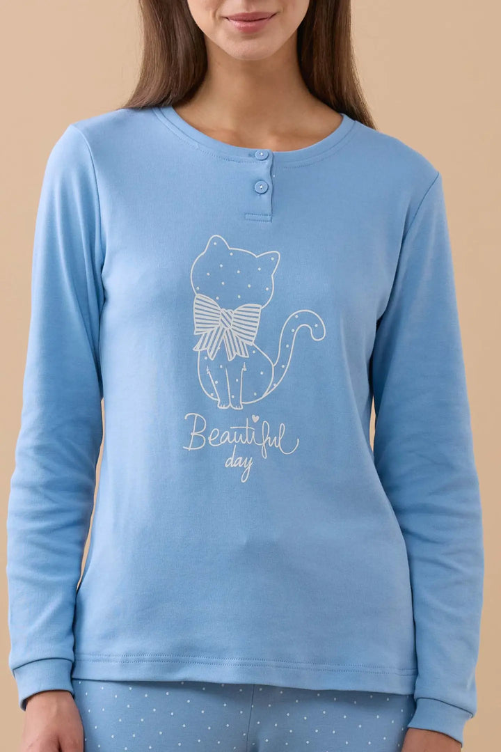 Pigiama donna invernale in caldo cotone con stampa pois. Top a due bottoni con gatto applicato e pantaloni con polsini sul fondo