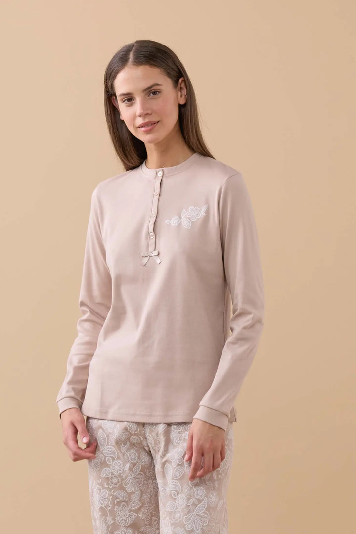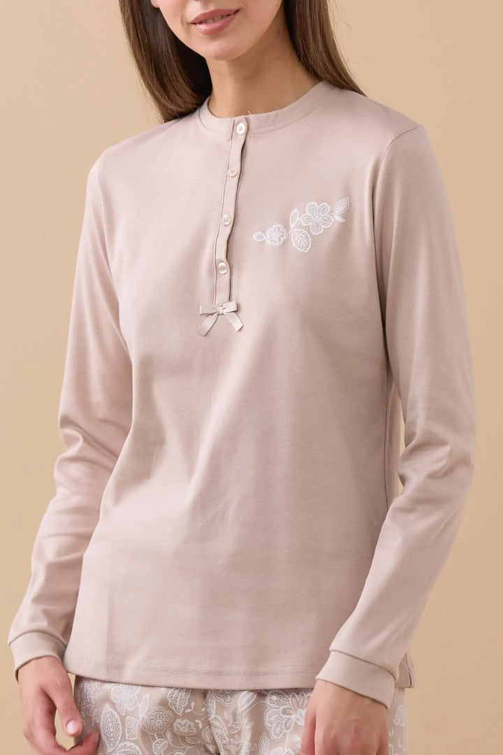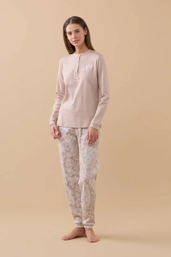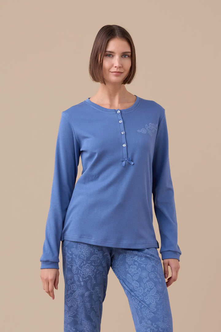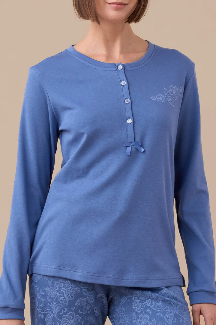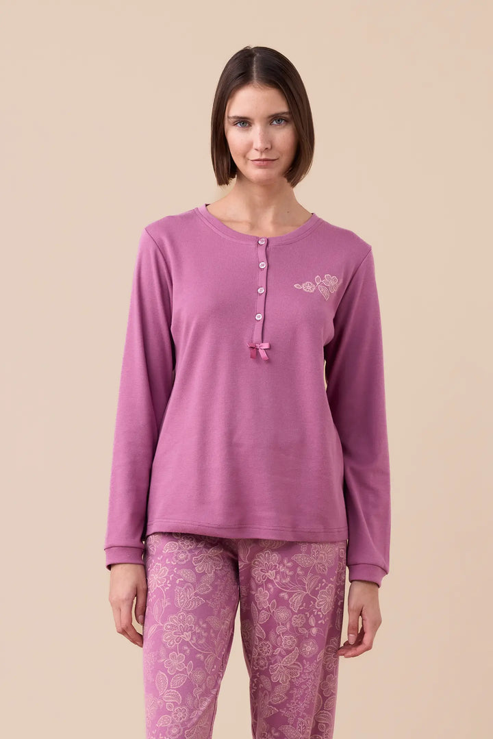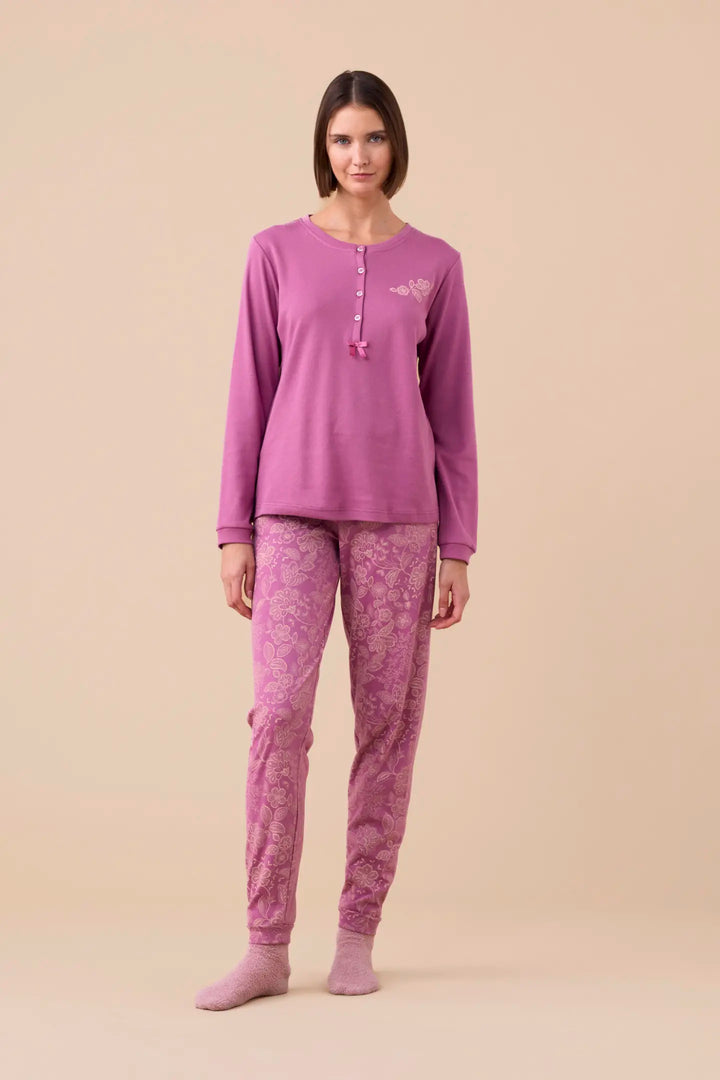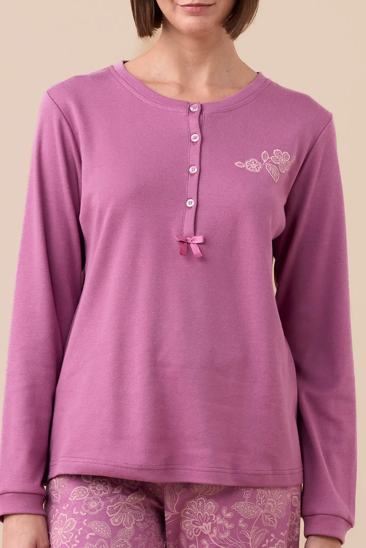 Pigiama donna in caldo cotone con fantasia fiori. Top unito a quattro bottoni e pantaloni stampati con polisini.