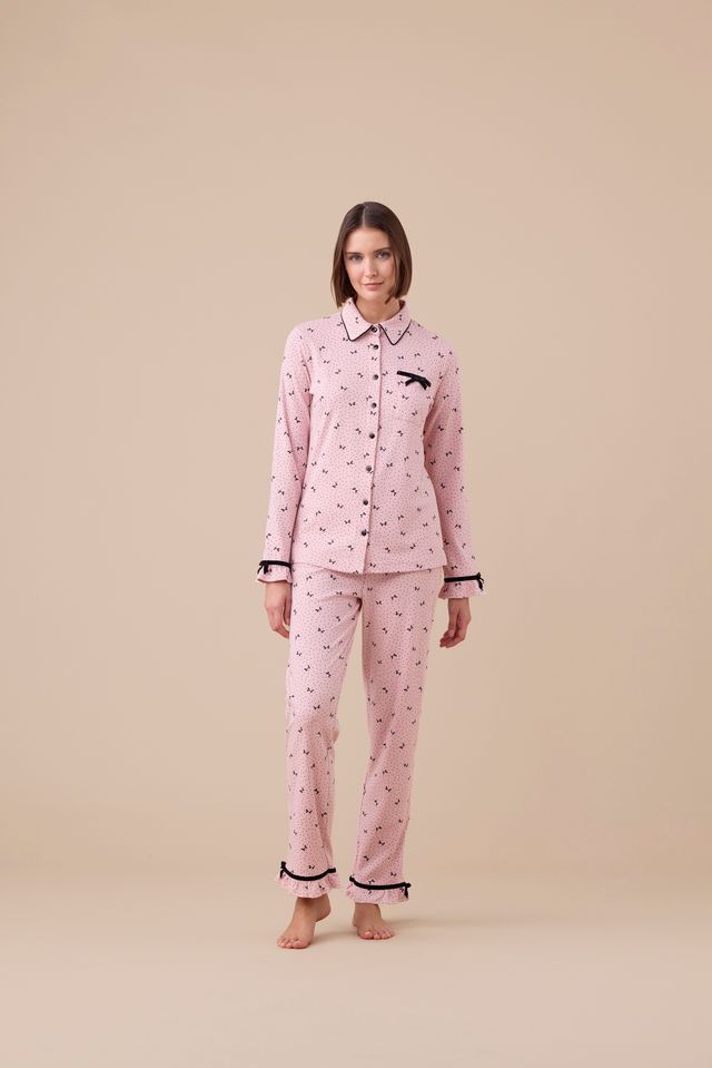 Pigiama donna in caldo cotone con fantasia fiocchi e pois. Top stile camicia con dettagli in velluto e pantaloni con volant sul fondo