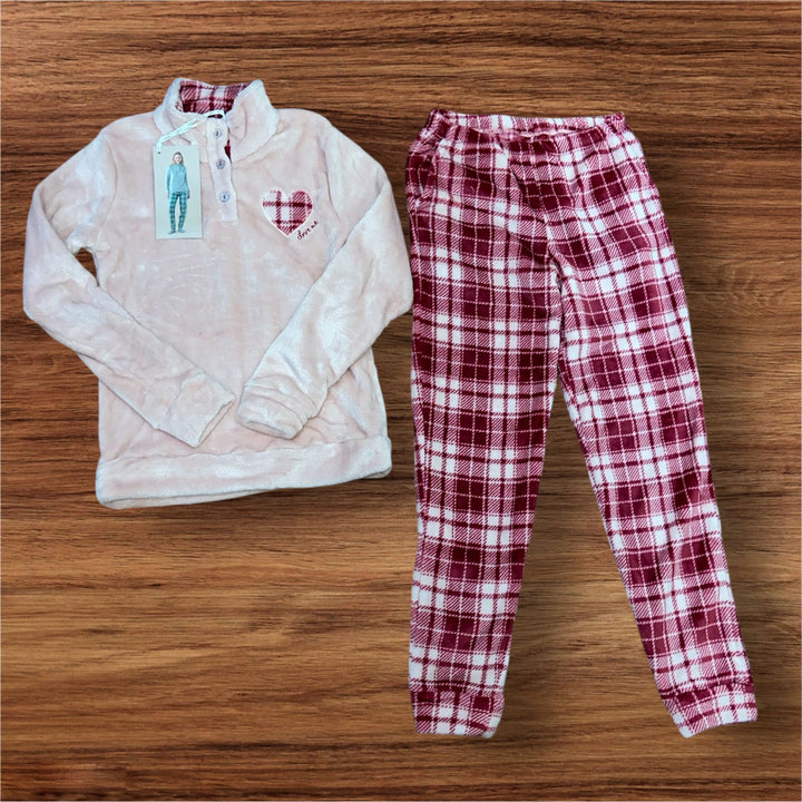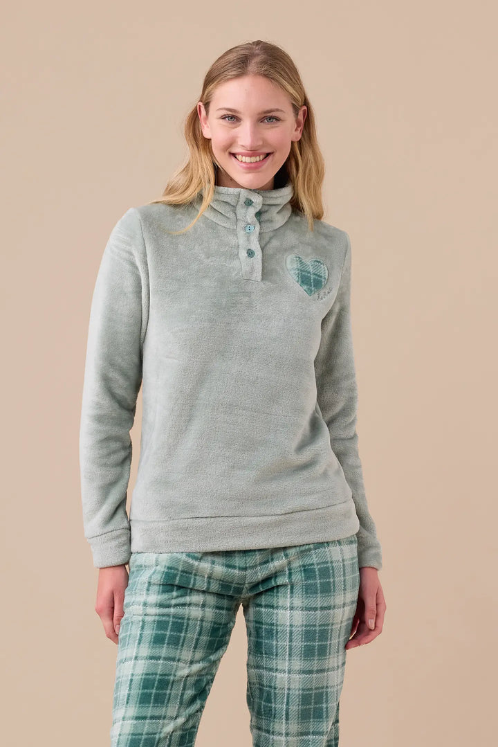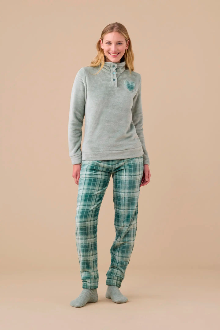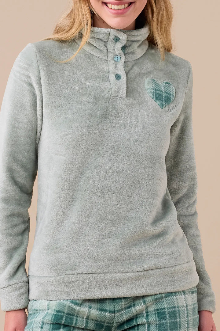Pigiama donna in coral con top unito a collo alto a tre bottoni e cuore applicato con stampa scozzese. Pantaloni con stampa scozzese e polsini.