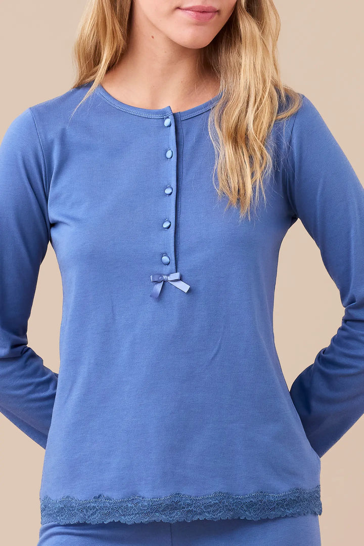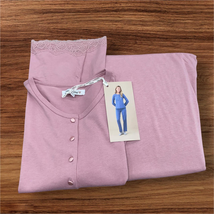 Pigiama donna in jersey invernale, top tinta unita a cinque bottoni con dettagli in pizzo, pantaloni tinta unita