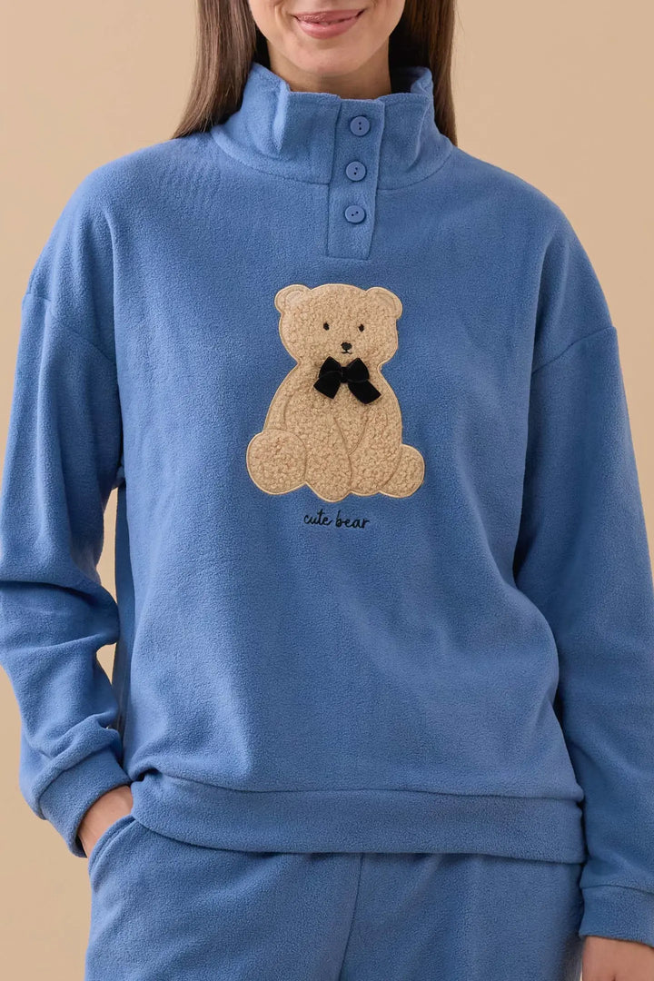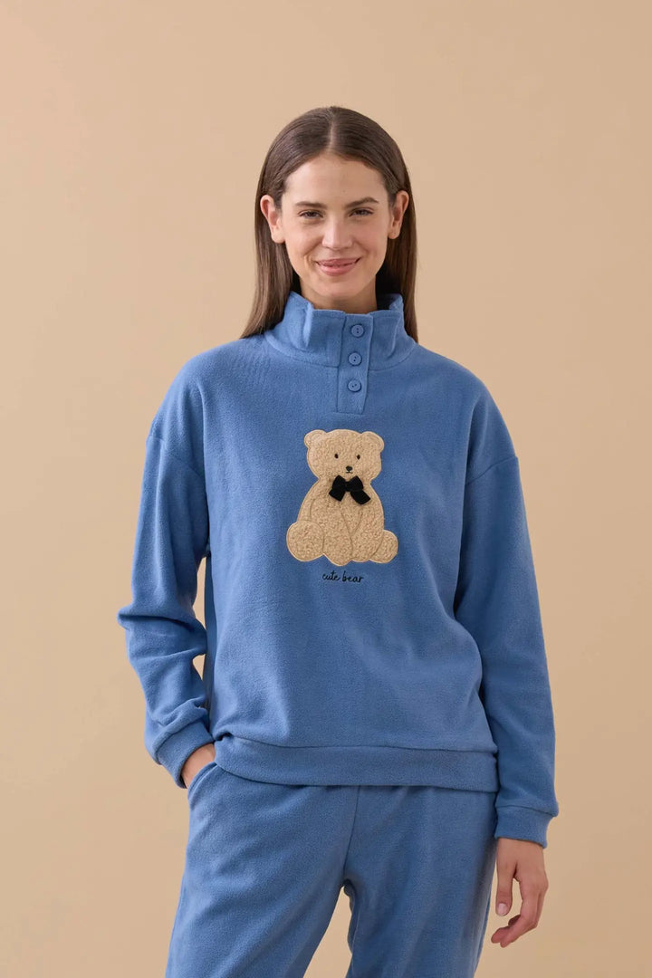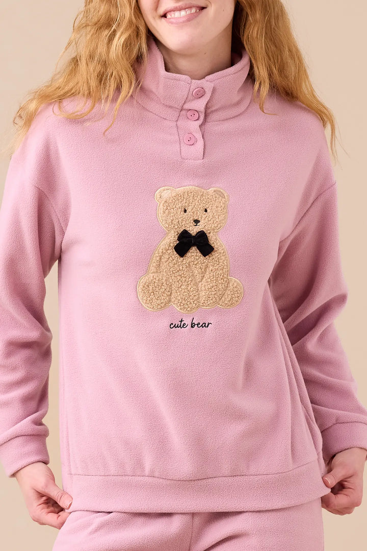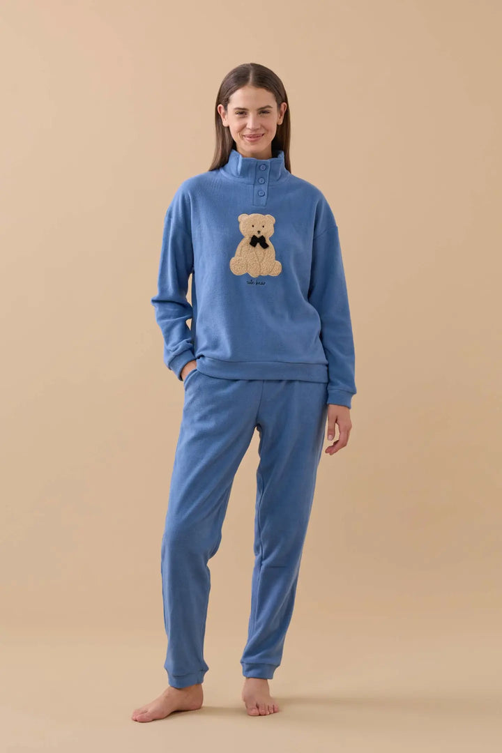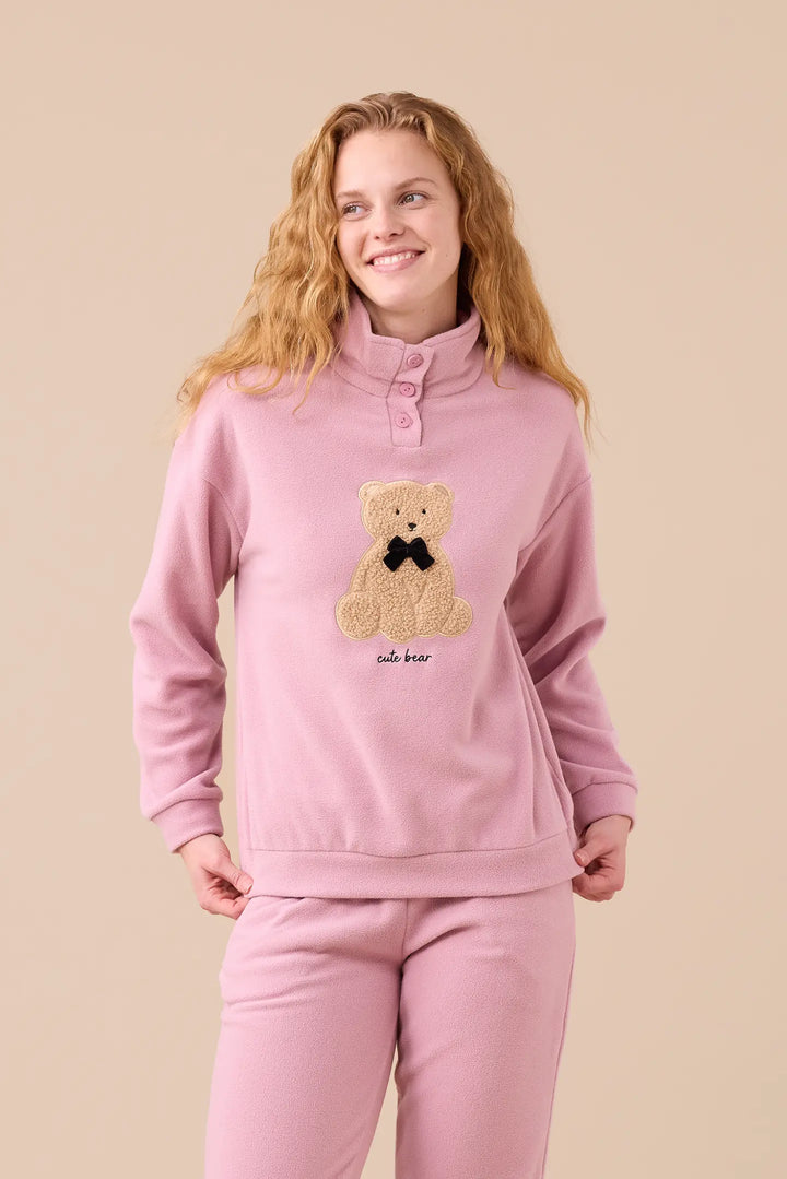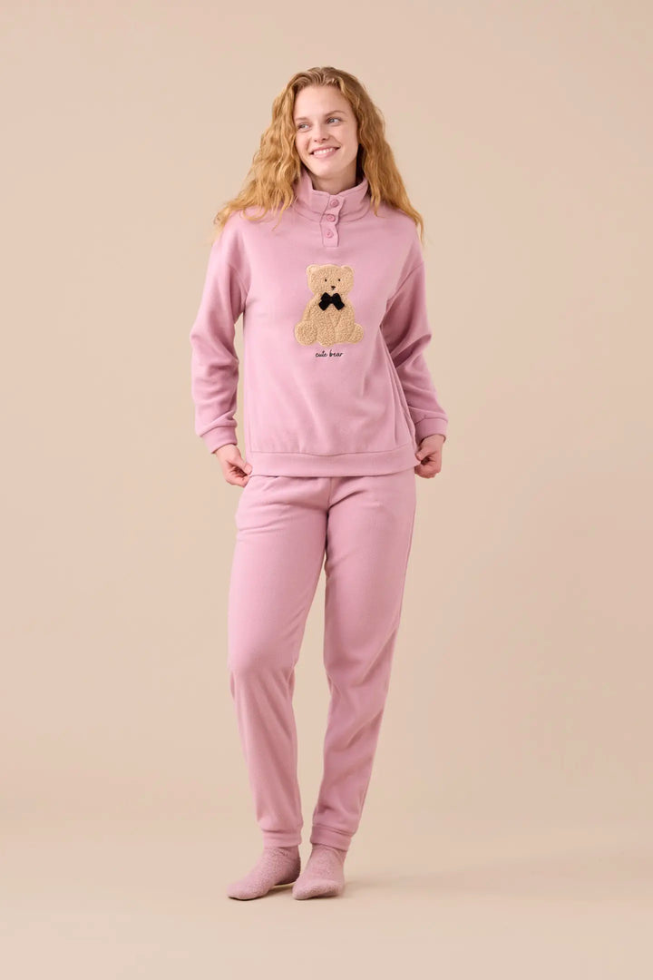 Pigiama donna invernale unito in micropile con collo 3 bottoni ed applicazione con orso e ficco in velluto e pantaloni con polsini sul fondo.