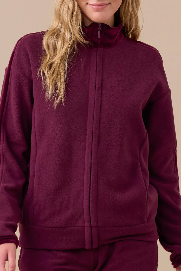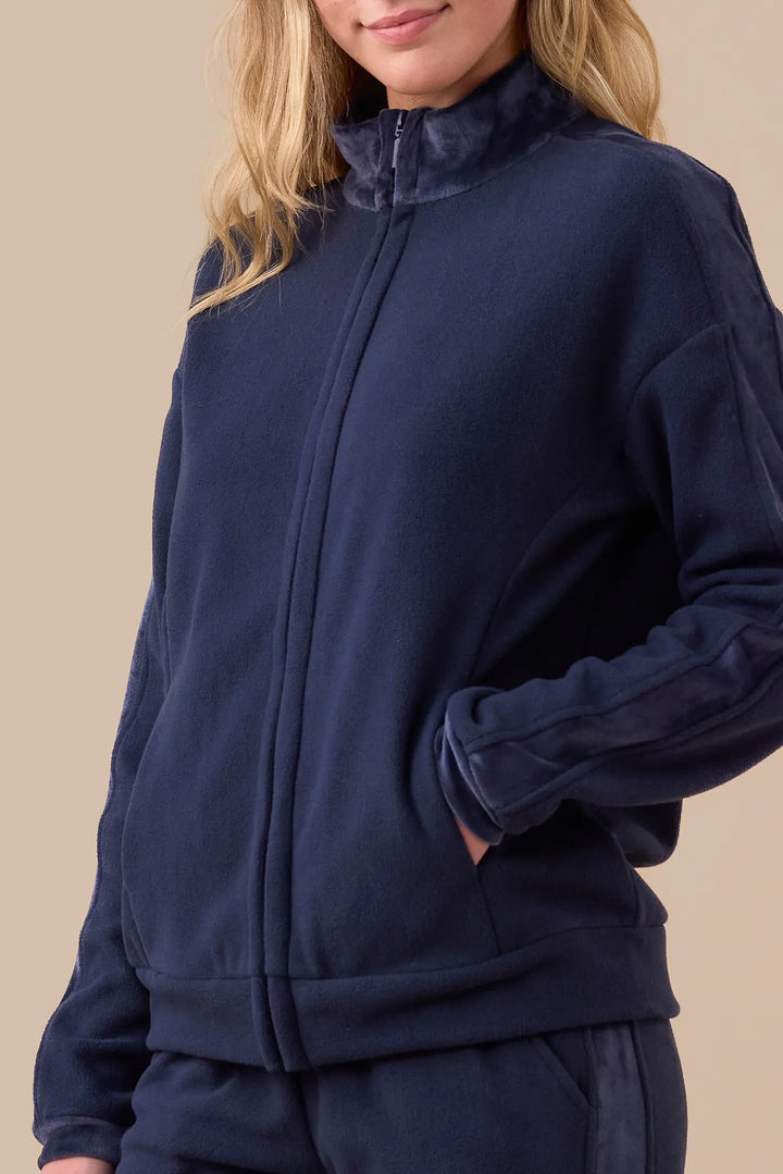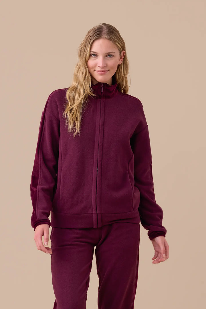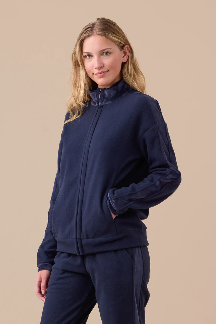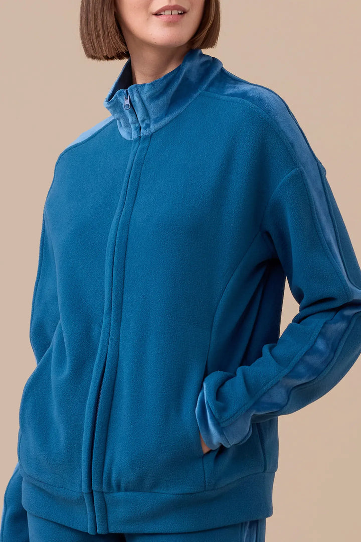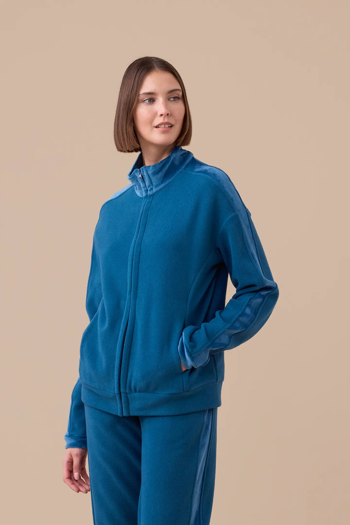 Completo donna in micropile, top tinta unita con zip e tasche ed inserti in ciniglia, pantaloni tinta unita con banda laterale e polsini in ciniglia.