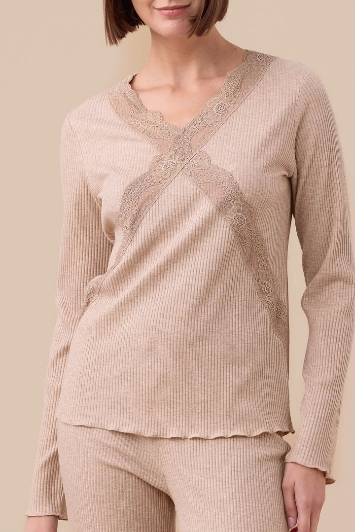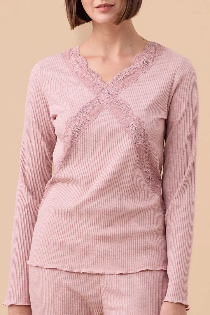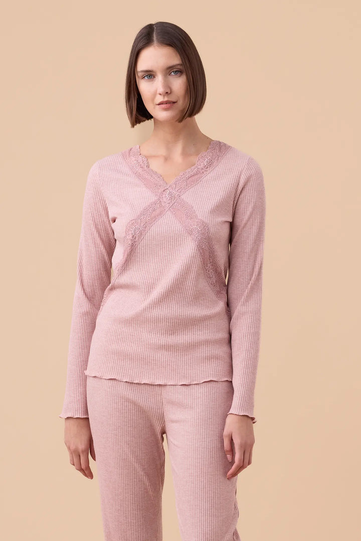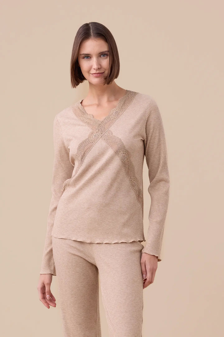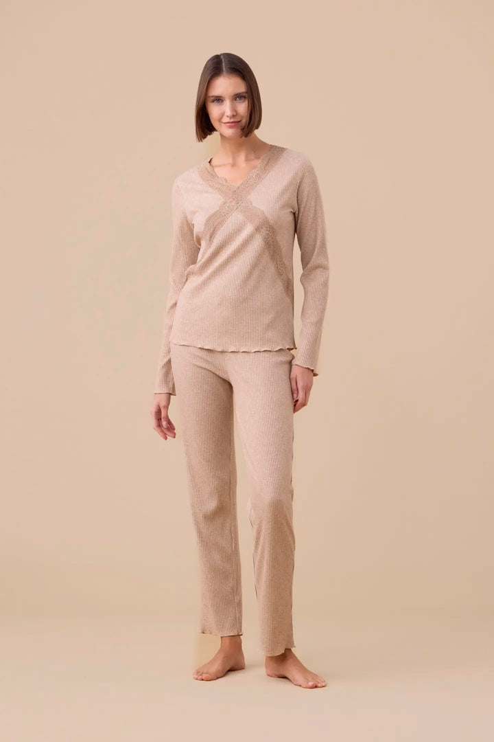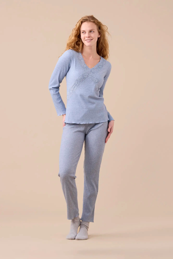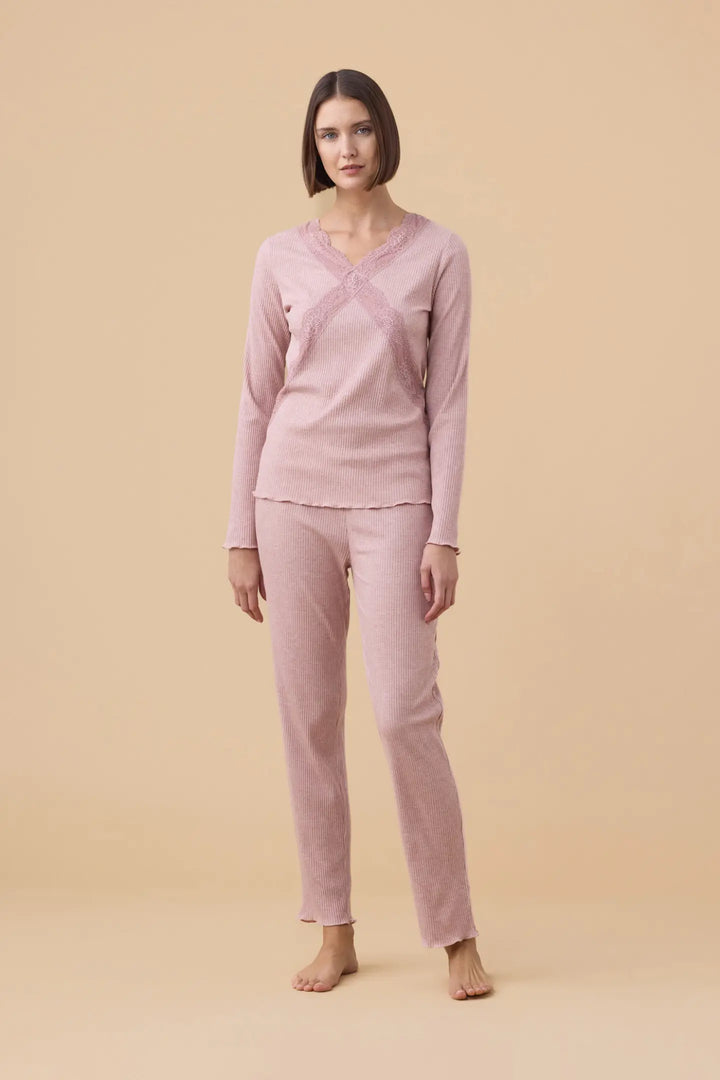 Pigiama donna in costina di viscosa. Top con scollo a V e dettagli in pizzo. Pantalone unito.
