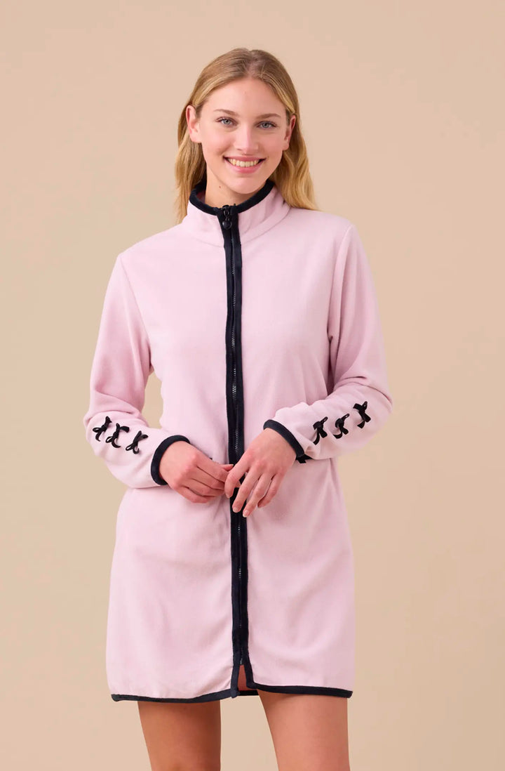 Vestaglia invernale donna in micropile con apertura sul davanti con zip e profili neri. Il dettaglio dei fiocchi applicati sulle maniche aggiunge un tocco femminile e ricercato